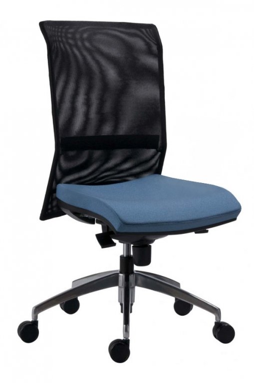 Čalouněný sedák, synchronní mechanismus s čtyřnásobnou aretací, automatickým nastavením síly protiváhy a nastavením hloubky sedáku, kolečka pro měkké podlahy, nosnost 150 kg, záruka 60 měsíců, český výrobek.