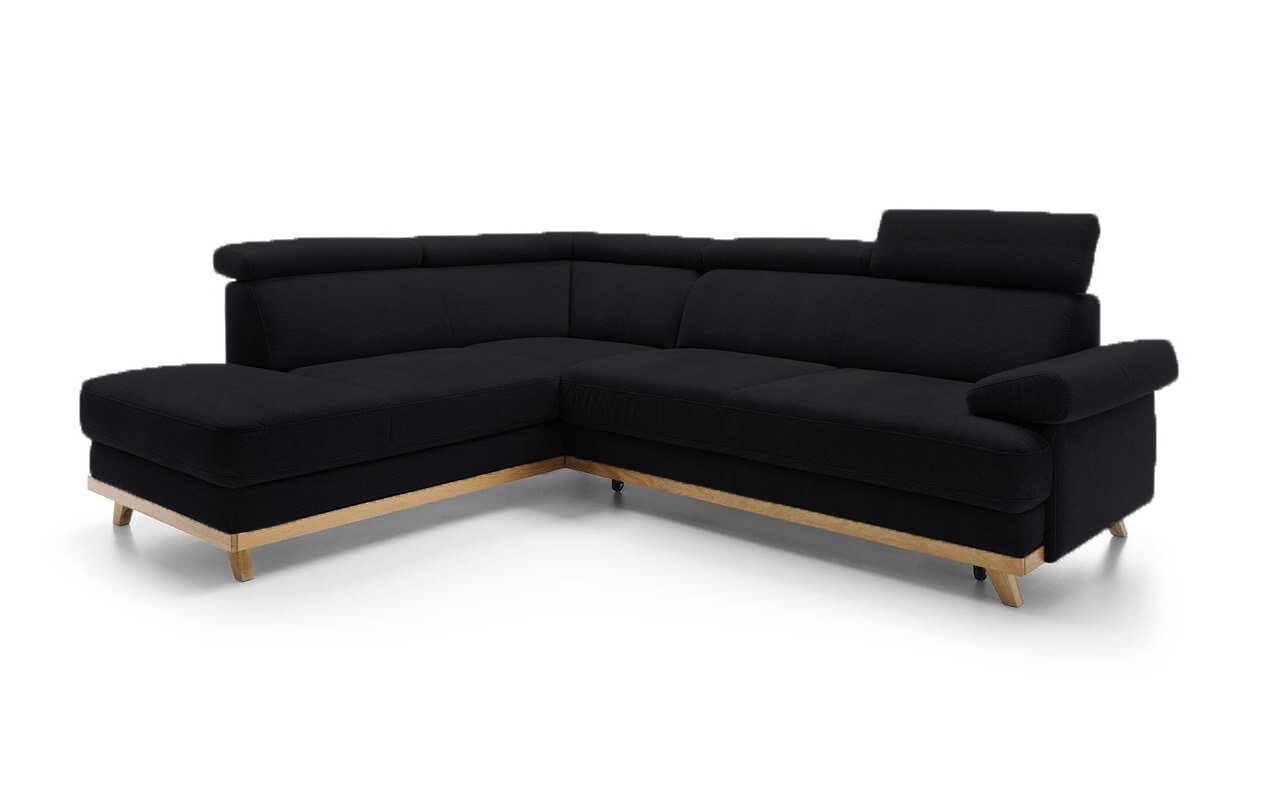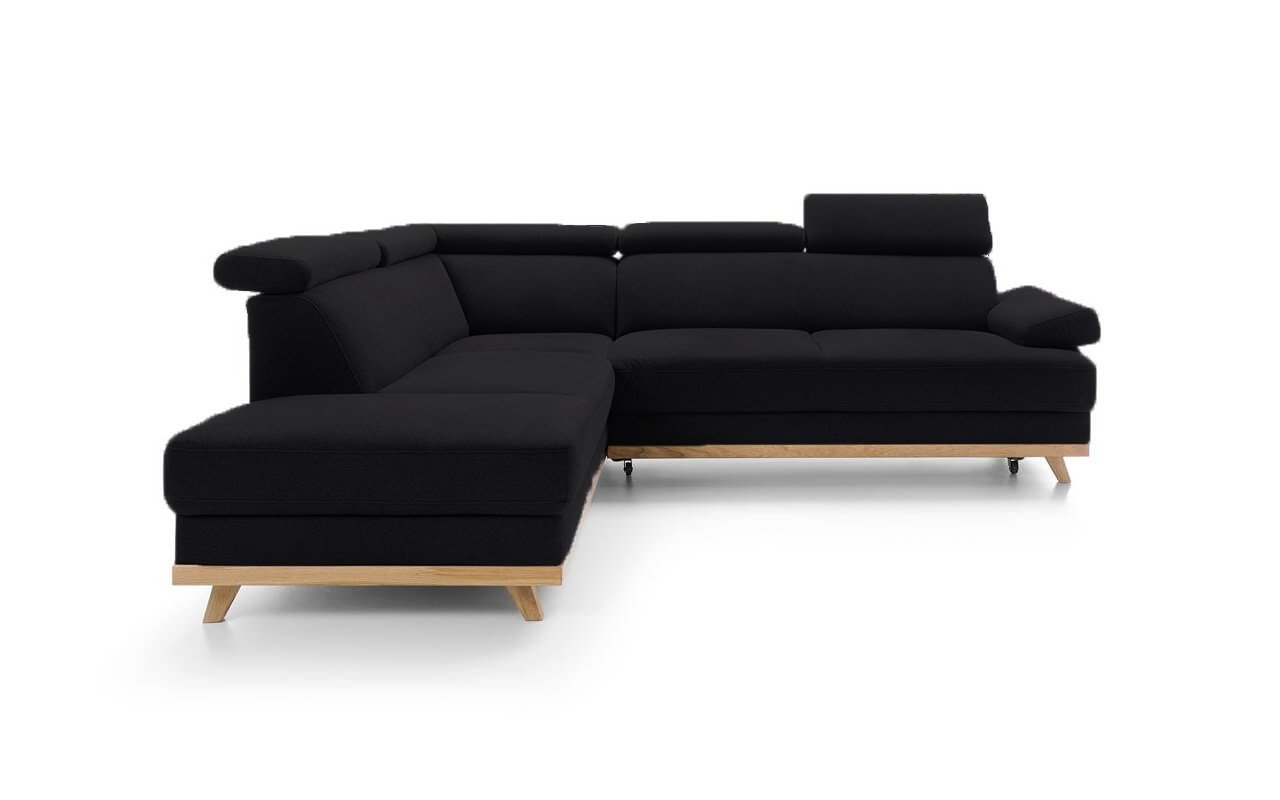 Elegantní rohová sedací souprava s komfortně měkkým sezením a polohovatelnými opěrkami hlavy nabízí skvělé pohodlí i praktičnost. Dřevěné nožičky dodáváme v různých odstínech. Vlastní výběr jejich moření uveďte do poznámky na konci objednávky.