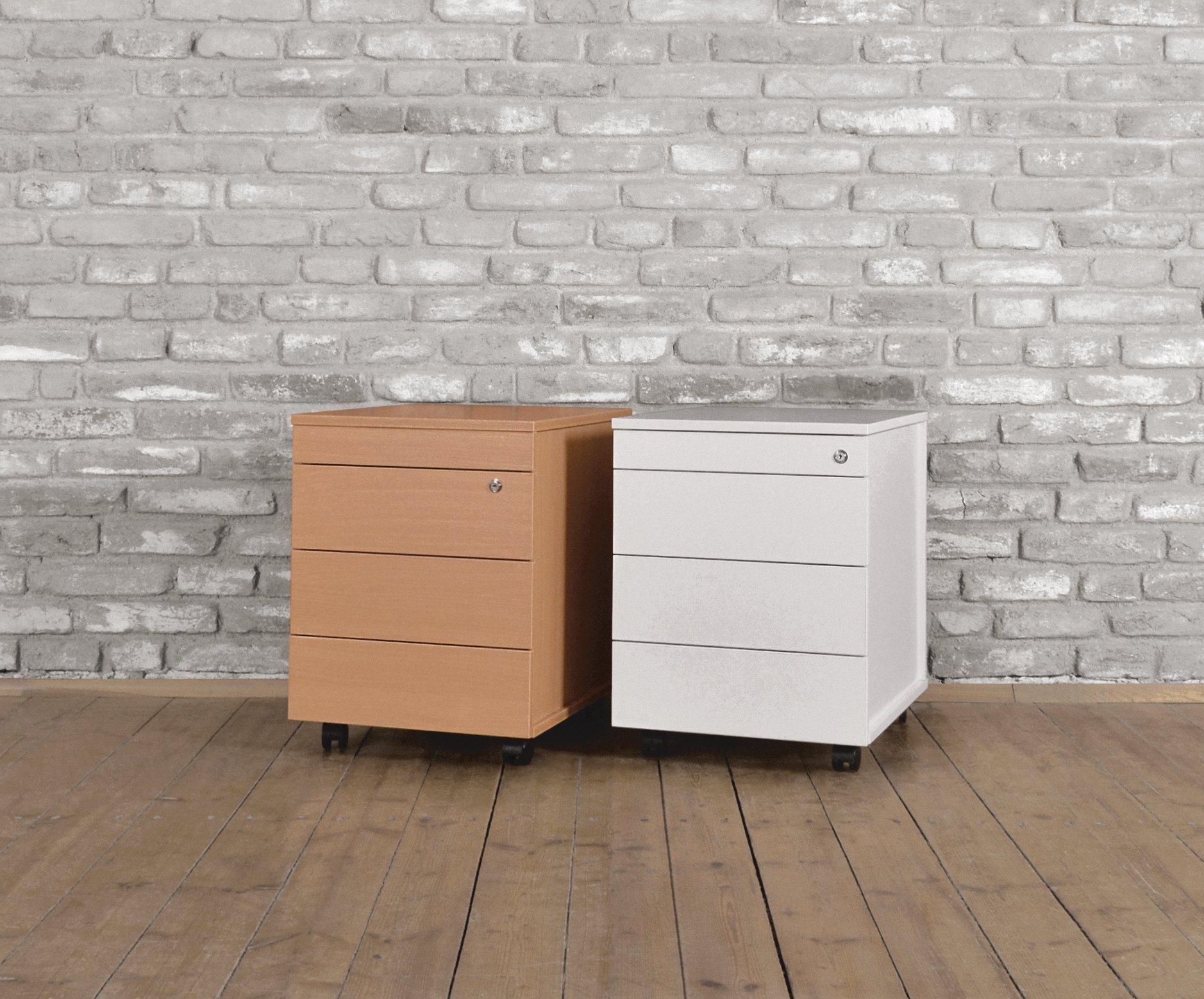 • Mobilní kontejner bezúchytkový 3 zásuvky, zámek horní zásuvky. Funkce úchytek je zastoupená přesahem čel zásuvek. Ideální mobilní úložný prostor pro každé pracoviště v mnoha variantách, ale stále ve vysoké kvalitě. Korpusy a čela zásuvek tloušťky 18 mm. Čela zásuvek naložená na korpusu, hrana ABS 2 mm. Vrchní deska kontejneru naložená, hrana ABS 2 mm. Kompaktní zásuvkový systém s blokací proti otevření více zásuvek, kuličkové výsuvyse samodovíračem. Plastové zásuvky. Kolečka s brzdou.