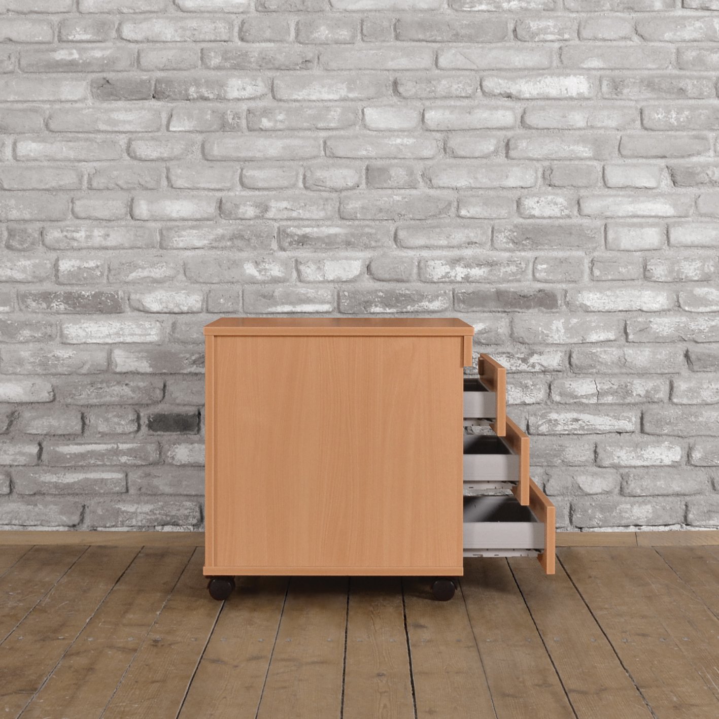 • Mobilní kontejner bezúchytkový 3 zásuvky, zámek horní zásuvky. Funkce úchytek je zastoupená přesahem čel zásuvek. Ideální mobilní úložný prostor pro každé pracoviště v mnoha variantách, ale stále ve vysoké kvalitě. Korpusy a čela zásuvek tloušťky 18 mm. Čela zásuvek naložená na korpusu, hrana ABS 2 mm. Vrchní deska kontejneru naložená, hrana ABS 2 mm. Kompaktní zásuvkový systém s blokací proti otevření více zásuvek, kuličkové výsuvyse samodovíračem. Plastové zásuvky. Kolečka s brzdou.