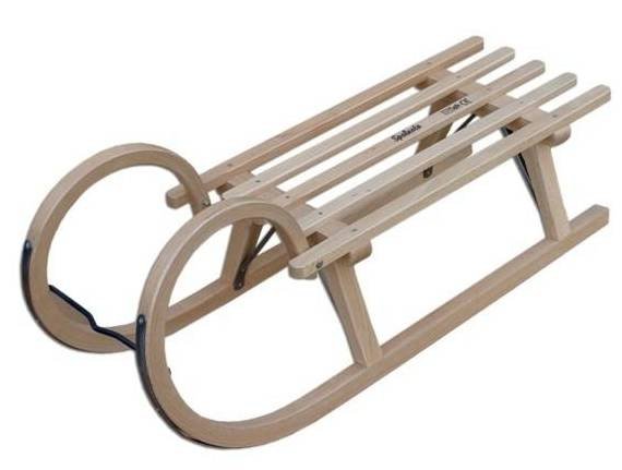 Dřevěné sáňky vyrobené z bukového dřeva.
