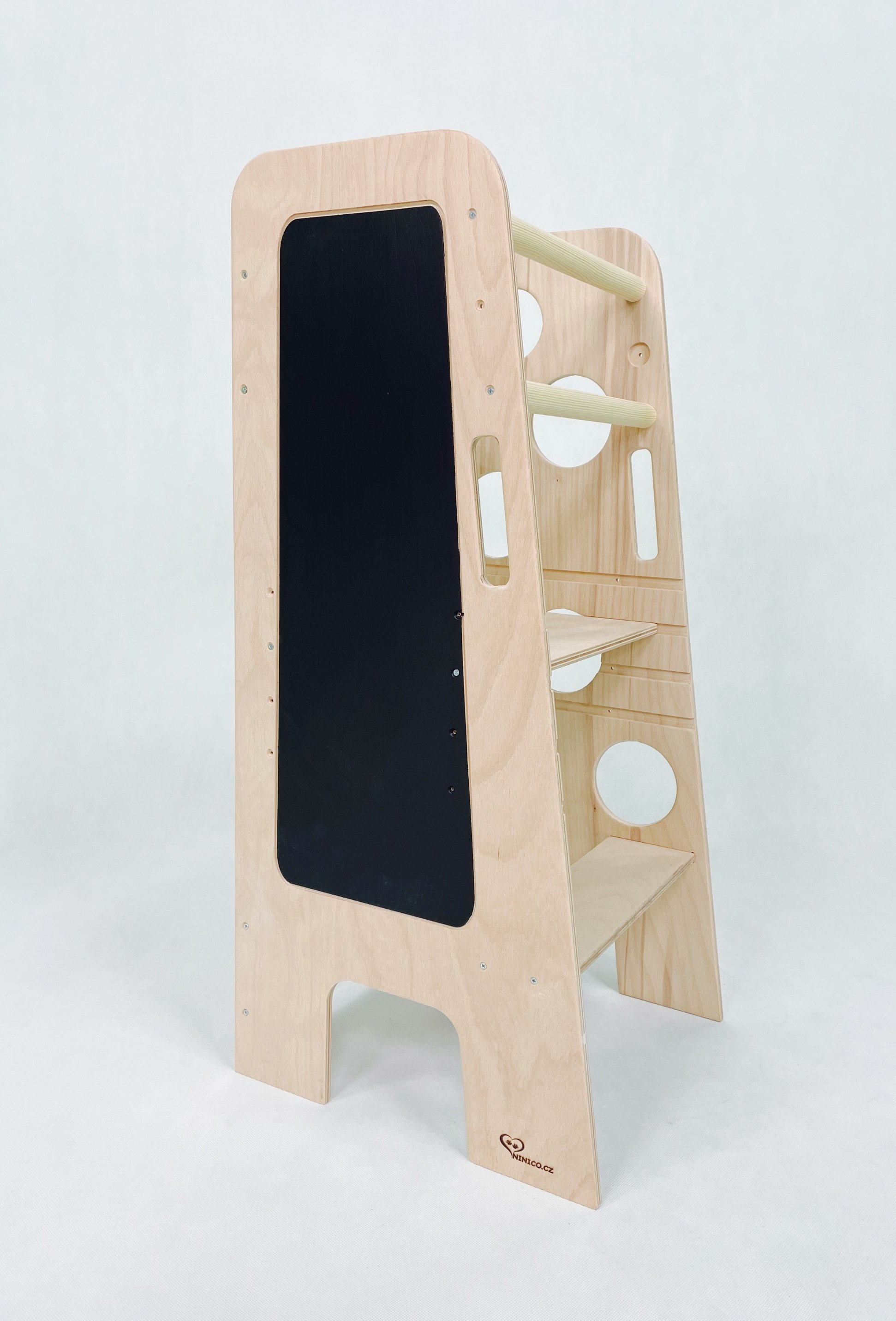 Vyrobeno z ekologicky nezávadného materiálu, buková překližka 15 mm. Pevná a stabilní konstrukce. Z boku věže kreslící tabulka na křídy. Zádové tyčky lze v pozdějším věku odstranit a dítě tak nemusí nic podlézat. Nastavitelný stupínek (hlavní podesta) lze nastavit na 35cm, 40cm a 45cm.