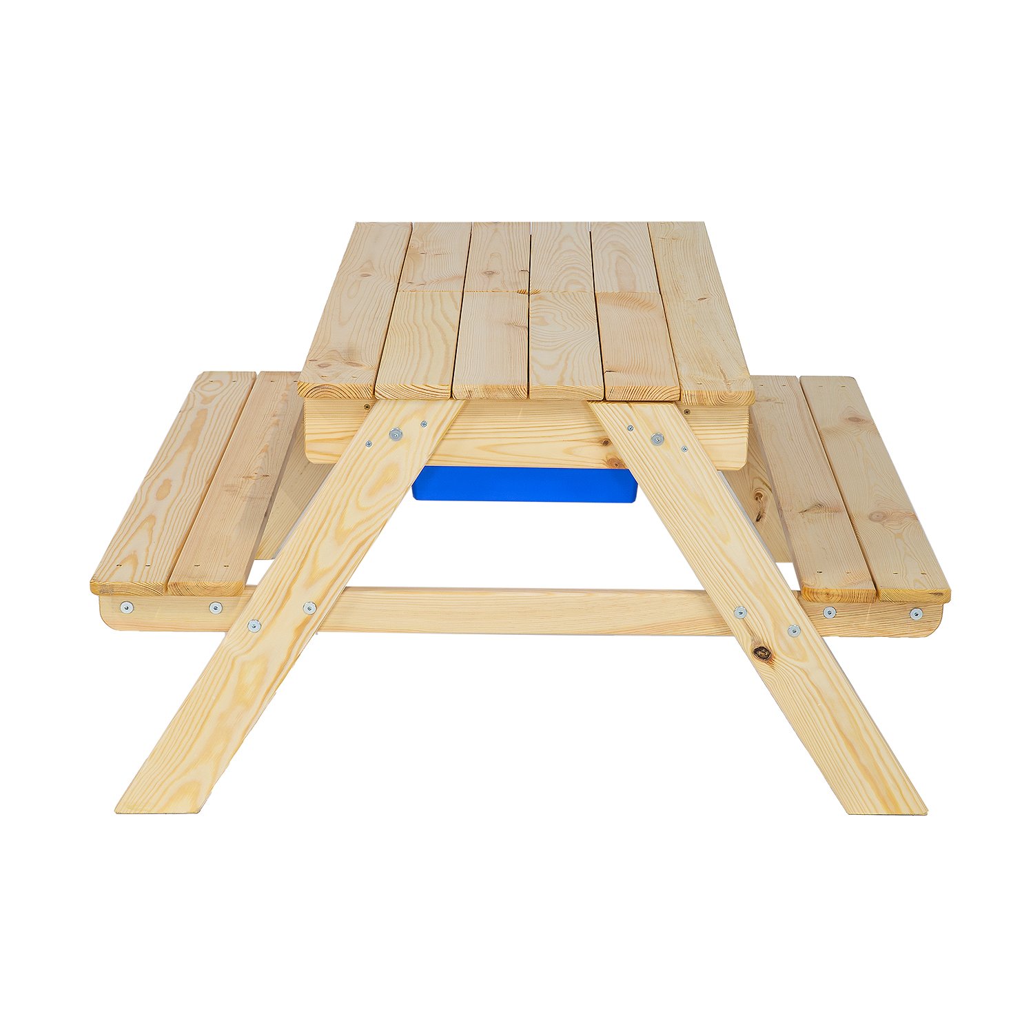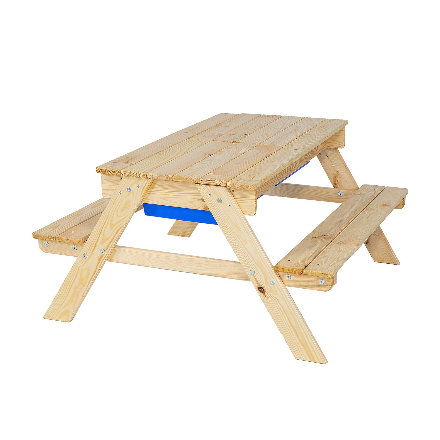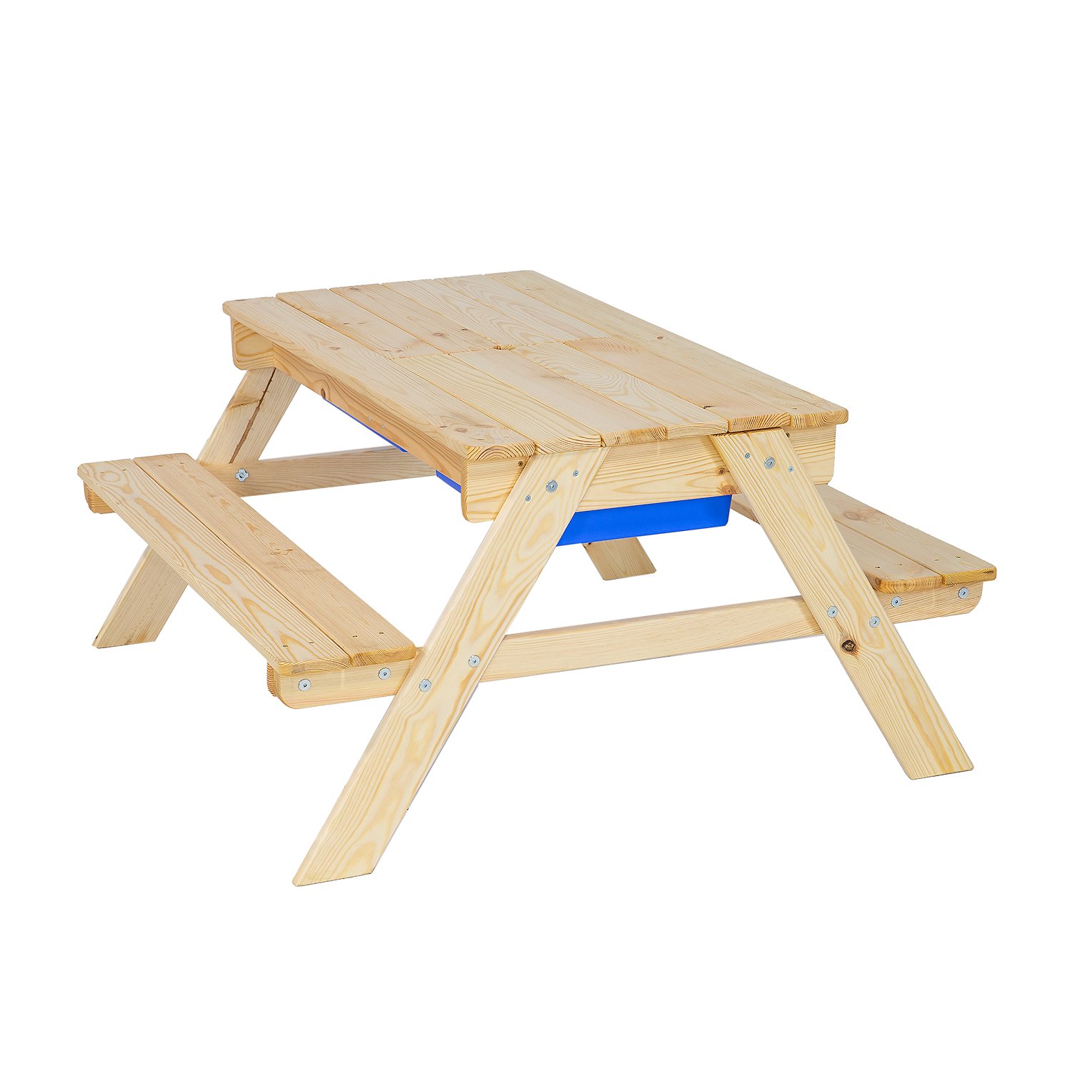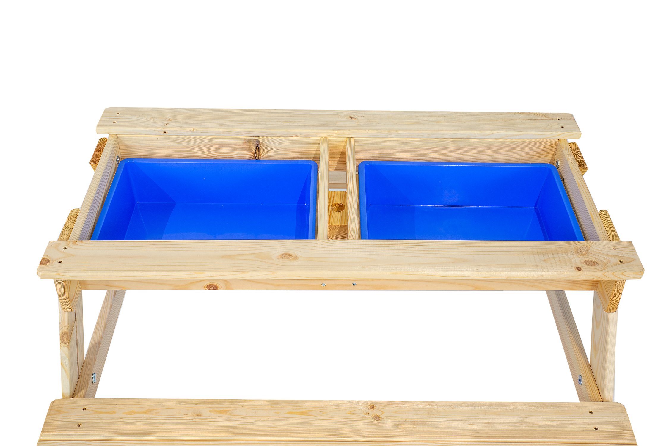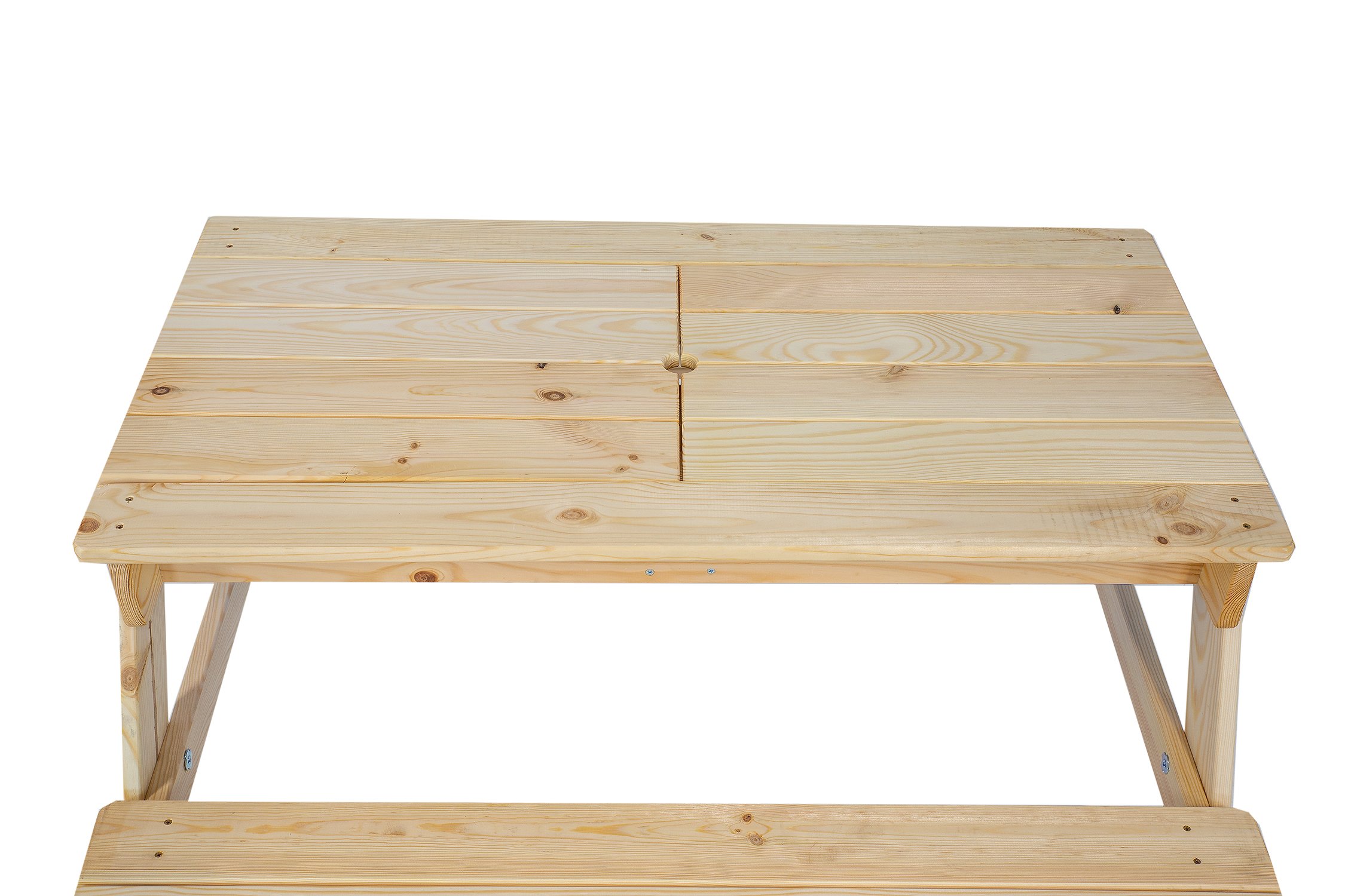 Pohodlná a praktická dětská souprava stolu a lavic z kvalitního smrkového dřeva. Kombinace stolu a dvou lavic se skvěle hodí na menší zahradu, dvorek nebo hřiště. Obsahuje dvě vyjímatelné, plastové zásuvky na hračky, písek nebo vodu, které zaujmou i to nejnáročnější batole. Odnímatelná horní část je vybavena otvorem pro montáž zahradního slunečníku. Slunečník není součástí dodávky. Rozměry: 95x50x95 cm. Nosnost 50kg.