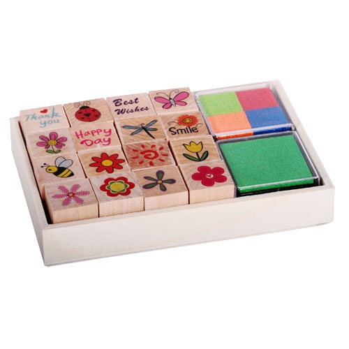 • Sada dřevěných razítek obsahuje 16 razítek s motivy kytiček. Vyrobeny jsou z prvotřídního materiálu a vhodné pro děti od 3 do 12 let. Děti si s razítky užijí nejen dostatek zábavy, ale razítka slouží také jako pomůcka pro rozvoj jemné motoriky, řeči, myšlení a podporují kreativitu a dětskou fantazii.