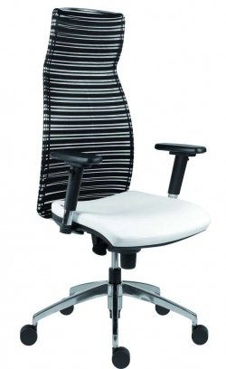 • Český výrobek, pracovní židle s vysokým opěrákem, prodloužený pro opěr hlavy, černo-bílá síťovina ERGO FLEX TM, čalouněný, prošívaný sedák, synchronní mechanismus s nastavením síly protiváhy a několikanásobnou aretací, aluminiová leštěná báze, mechanismu SL (sliding) k nastavení hloubky sedáku, výškově nastavitelné područky, kolečka s větším průměrem, (O 65 mm), nosnost 130 kg, záruka 60 měsíců. Cena včetně područek.