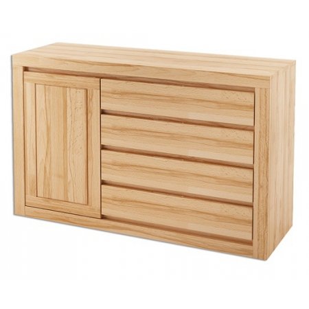 Dřevěná komoda se 4 zásuvkami a dvířky je vyrobena z přírodního pařeného bukového dřeva.U dveří jsou použity kvalitní kovové panty s úhlem otevření 110°. Zásuvky 100% výsuv s dotekem. K výrobě je použitý prvotřídní materiál a pro povrchovou úpravu je použitý ekologický lak. Tyto komody se vyznačují pečlivým zpracováním a dlouhou životností. V základní ceně je komoda z bukového dřeva v přírodní barvě. Moření dle vzorníku je za příplatek 10% + 20 % z ceny.