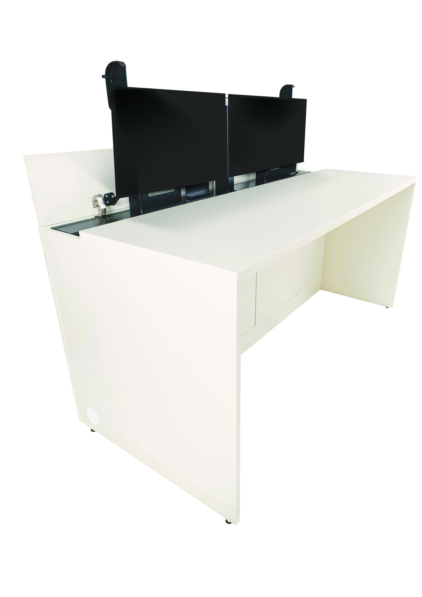 • Náš dvojmiestny stôl je ideálnym riešením pre moderné učebne. Vďaka integrovanému elektrickému výsuvu pre počítačové vybavenie ponúka študentom maximálne pohodlie, bezpečnosť a flexibilitu. Tichý a hladký pohyb výsuvu, spolu s bezpečnostnými prvkami, zaručujú bezproblémovú prevádzku. Zabudované vedenie káblov a praktická polica na klávesnici a myš udržujú pracovný priestor uprataný. Stolová doska LTD hr. 25 mm, korpus z LTD hr. 18 mm vybavená ABS hranou. Prístup do dutiny s výsuvom pomocou uzamykateľných revíznych dvierok z vnútornej časti stola. Otváravý priestor je z hornej časti zakrytý doskou z LTD min. hr. 18 mm s funkciou samočinného uzatvárania a otvárania. Po uzavretí je výklopná doska automaticky zaistená proti otvoreniu pre bezpečnosť žiaka. Výsuv monitorov je zaistený pomocou trojdielneho zdvíhacieho stĺpika s motorovým pohonom, antikolizným bezpečnostným systémom as programovateľnou výškou zdvihu, ktorý zabezpečuje plynulý a tichý chod. Stôl s výsuvným systémom je vybavený adaptérmi na uchytenie monitorov, mechanizmom na samočinné otváranie a uzatváranie veka a profilovanou policou z oceľového plechu, ktorá je výsuvná spoločne so stĺpikom, profilovaná polica umožňuje uloženie klávesnice a myši.