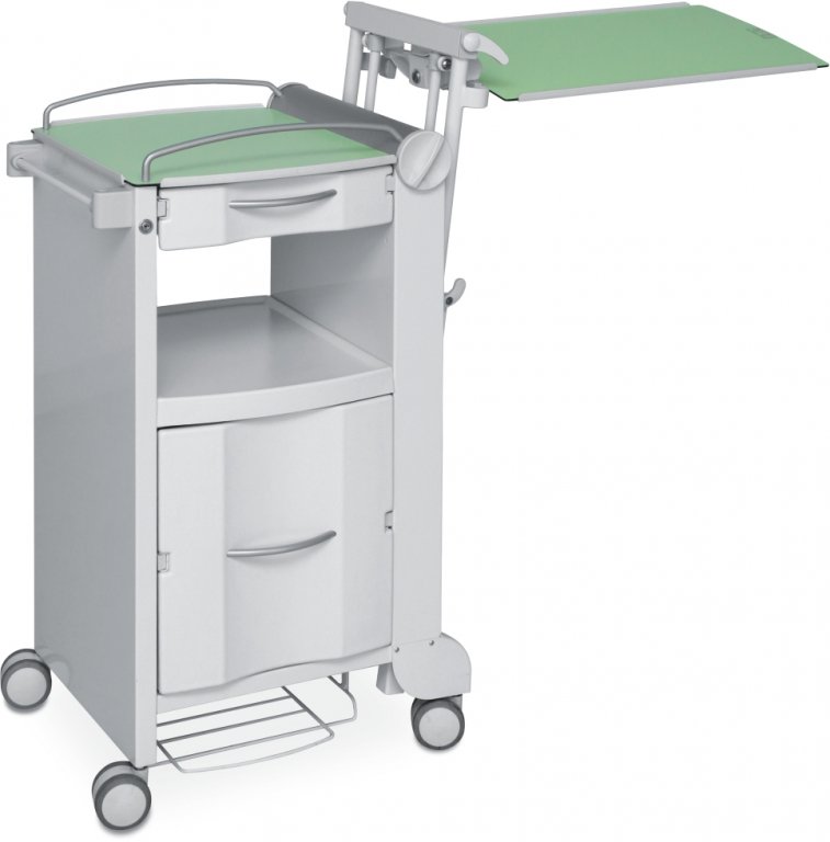 Pojazdný, obojstranný kovový stolík k lôžku. Korpus z pozinkovaného lakovaného plechu. Prevedenie: zásuvka (obojstranne prístupná), nika, zásuvka, skrinka s dvierkami. Čelá zásuviek z ABS plastu, vrchná doska a jedálenská doska z vysokotlakového laminátu (HPL). Vyberateľné plastové vložky v zásuvkách, ľahko čistiteľné. 4 dvojité kolieska o 75 mm, z toho 2 s brzdou.