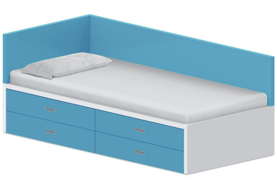 Lôžko so štyrmi úložnými dielmi. Pravé. Detské postele vo variante aj pre dieťa s rodičom s praktickou zábranou, vyrobené z materiálu laminotrieskovej dosky olepenej hranou ABS 2 mm. Zásuvky osadené záťažovými guľôčkovými výsuvmi s možnosťou 100% vysunutiu. Spodné veľké zásuvky s jednosmernými kolieskami na tvrdý povrch. Dodávané štandardne v zmontovanom stave. Uvedené ceny sú bez matracov.