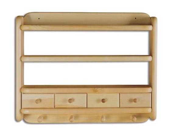 Drevená polička je vyrobená z kvalitného borovicového dreva. Povrch je upravený ekologickým zdravotne nezávadným lakom. Drevené zásuvky na kolieskových výsunoch s 2/3 otvorením. Polička je vybavená vešiakmi. Základná cena police z masívnej borovice je v prírodnej farbe, za príplatok morenia podľa vzorkovníka. Vyberať môžete z rôznych farebných odtieňov, ktoré nájdete v záložke „varianty“.