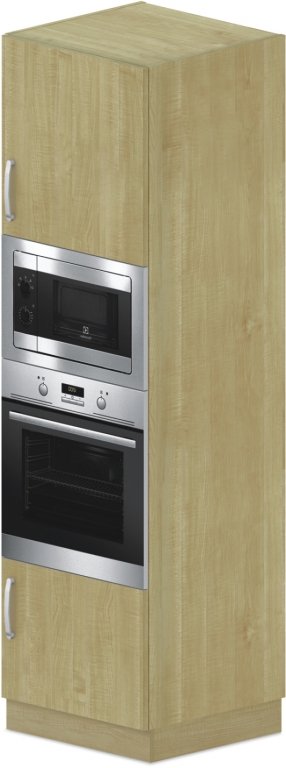 Pravá. Na vstavanú rúru a mikrovlnnú rúru. Maximálne rozmery mikrovlnnej rúry: š. 594 mm x hl. 570 mm x v. 450 mm. Maximálne rozmery rúry: š. 594 mm x hl. 570 mm x v. 594 mm. Skrine s pevným obojstranne pohľadovým chrbtom, soklom o výške 100 mm as dverami vyrobenými z laminotrieskovej dosky s hrúbkou 18 mm, olepené hranou ABS, pri dverách o hrúbke 2 mm, ostatné hrany ABS 0,5 mm. Úchytky kovové. Skrine vybavené nastaviteľnými klzákmi pre možnosť vyrovnania podlahovej nerovnosti. Expedované v zmontovanom stave.