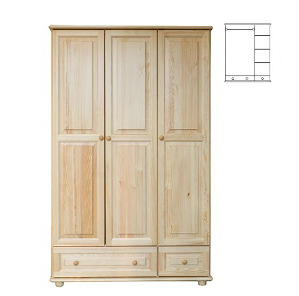 • Třídvéřová dřevěná skříň z masivní přírodní borovice je povrchově upravená lakováním. Skříň obsahuje zásuvku, šatní tyč a 3 police. U dveří jsou použity kvalitní kovové panty s úhlem otevření 110°. Skříně je vyrobena ze 100% přírodního dřeva, masívu borovice. K výrobě skříní je použitý prvotřídní materál a pro povrchovou úpravu ekologický lak. Tyto skříně se vyznačují pečlivým zpracováním a dlouhou životností. V základní ceně je skříň z borovicového dřeva v přírodní barvě. Moření dle vzorníku je za příplatek 10% z ceny.