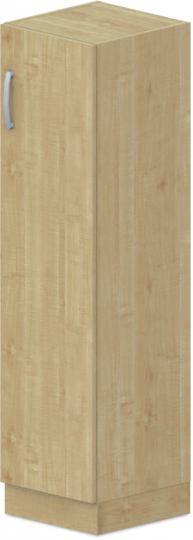 • Skriňa policová, dvierka Počet políc: 3 Policové skrine z laminotrieskovej dosky s pevným obojstranne pohľadovým chrbtom s hrúbkou 18 mm. Sokel o výške 100 mm olepený hranou ABS 2 mm, ostatné hrany olepené ABS 0,5 mm. Skrine majú vždy vo výške 825 mm a 1175 mm pevnú policu na zaistenie maximálnej tuhosti konštrukcie. Ostatné police voľné, prestaviteľné. Úchytky kovové. Skrine vybavené nastaviteľnými klzákmi pre možnosť vyrovnania podlahovej nerovnosti. Expedované v zmontovanom stave.