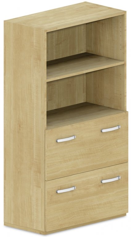 Skriňa policová, registratúry/niky 100% výsuv, max. záťaž na jednu registračnú zásuvku 15 kg, systém pre závesné dosky Skrine z laminotrieskovej dosky s pevným obojstranne pohľadovým chrbtom s hrúbkou 18 mm. Sokel s výškou 25 mm olepený hranou ABS 2 mm, ostatné hrany olepené ABS 0,5 mm. Zásuvky s kovovými výsuvmi. Skrine majú vždy vo výške 750 a 1100 mm pevnú policu na zaistenie maximálnej tuhosti konštrukcie. Ostatné police voľné, prestaviteľné. Úchytky kovové. Skrine vybavené nastaviteľnými klzákmi pre možnosť vyrovnania podlahovej nerovnosti. Expedované v zmontovanom stave.