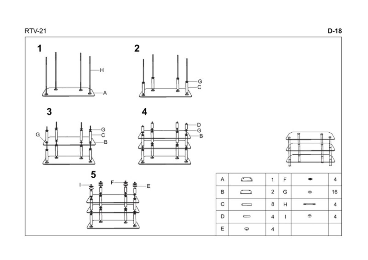 Stůl se skládá z desek z tvrzeného černého skla a konstrukce stolu je vyrobena z lakované oceli. Moderní televizní stolek poskytuje dostatek úložného prostoru pro veškerou elektroniku. Tloušťka horní skleněné desky je 8 mm, spodní desky jsou silné 6 mm.