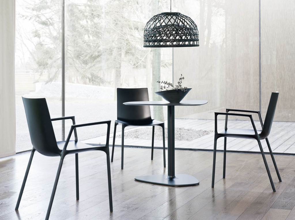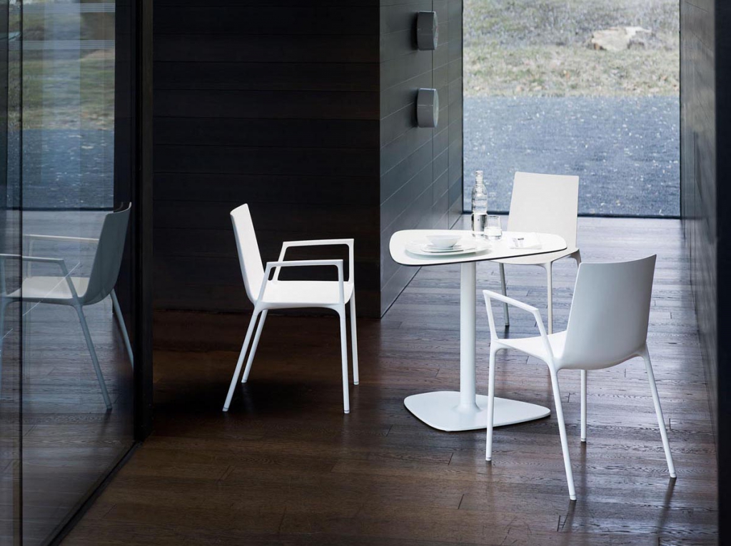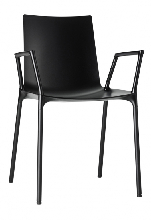 • Návrh židle sjednocuje zdánlivě protichůdné vlastnosti – na jedné straně jemný a citlivý zjev, na druhé straně odolná robustní konstrukce. Lícní stranu umělohmotné skořepiny charakterizuje jasná, plynulá kontura – nepřerušovaná a klidná. Nohy vypadají, jako by vyrůstaly přímo ze spodní strany skořepiny. Tloušťka umělohmotné skořepiny se od okraje směrem ke středu sedací polohy zvětšuje. Vzniká tak stabilizující kříž, který zaručuje nezbytnou nosnost. Nohy z lakovaných trubek jsou se sedací skořepinou sešroubovány jednotlivě. Podnož je z precizních ocelových trubek, navíc s hluk tlumícími univerzálními kluzáky z umělé hmoty pro tvrdé i měkké povrchy. Židle má područky, které jsou již zahrnuty v ceně.